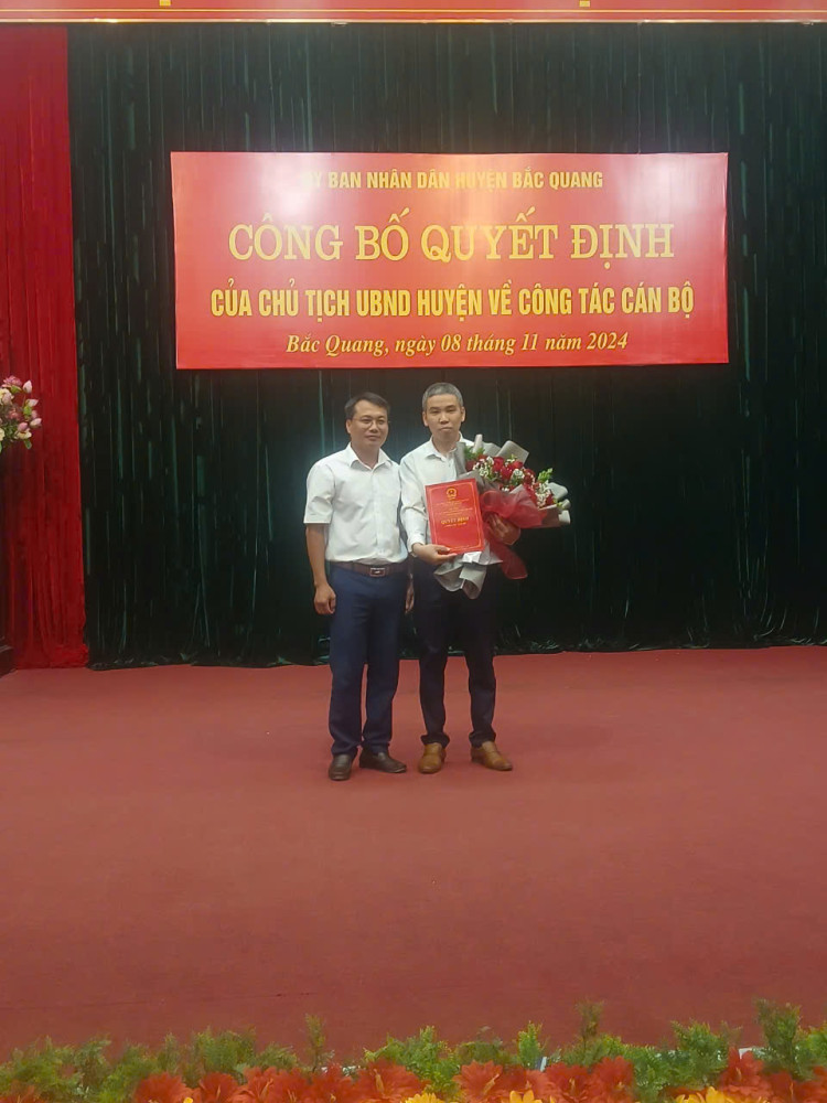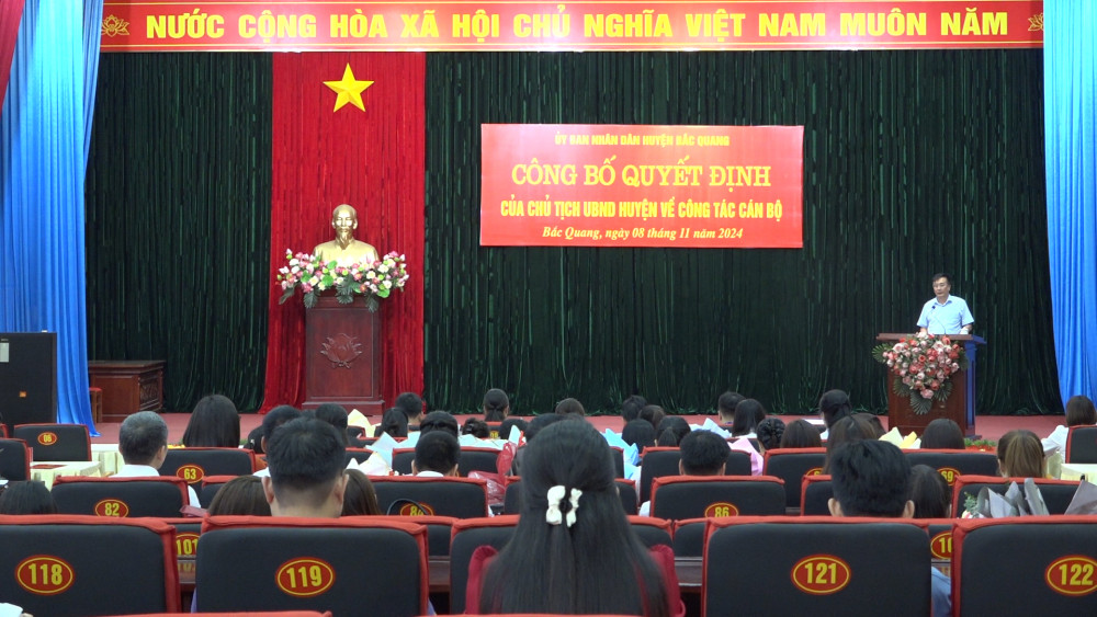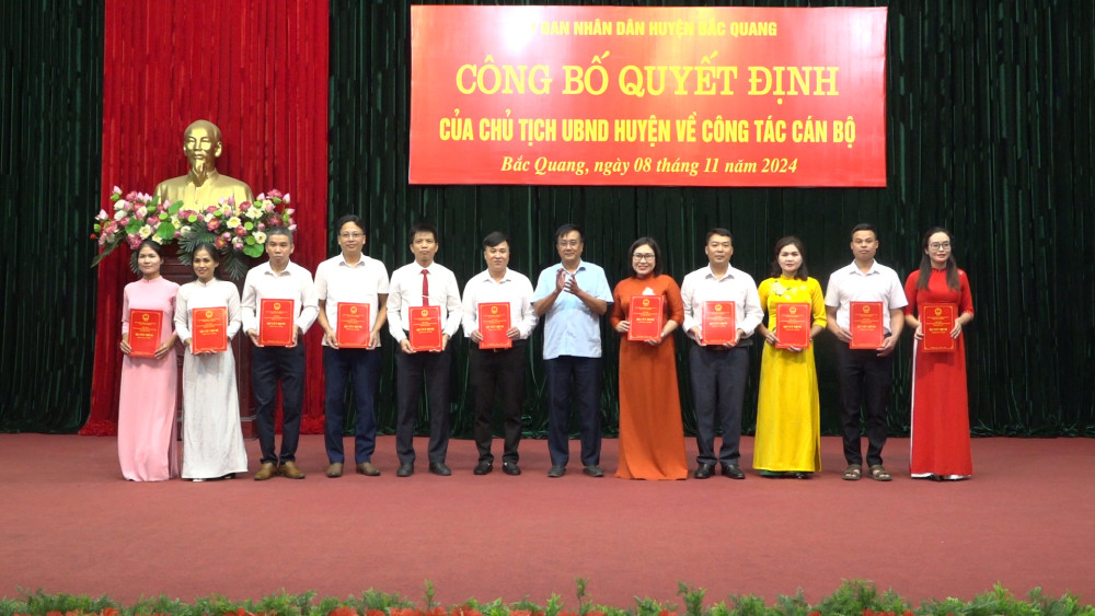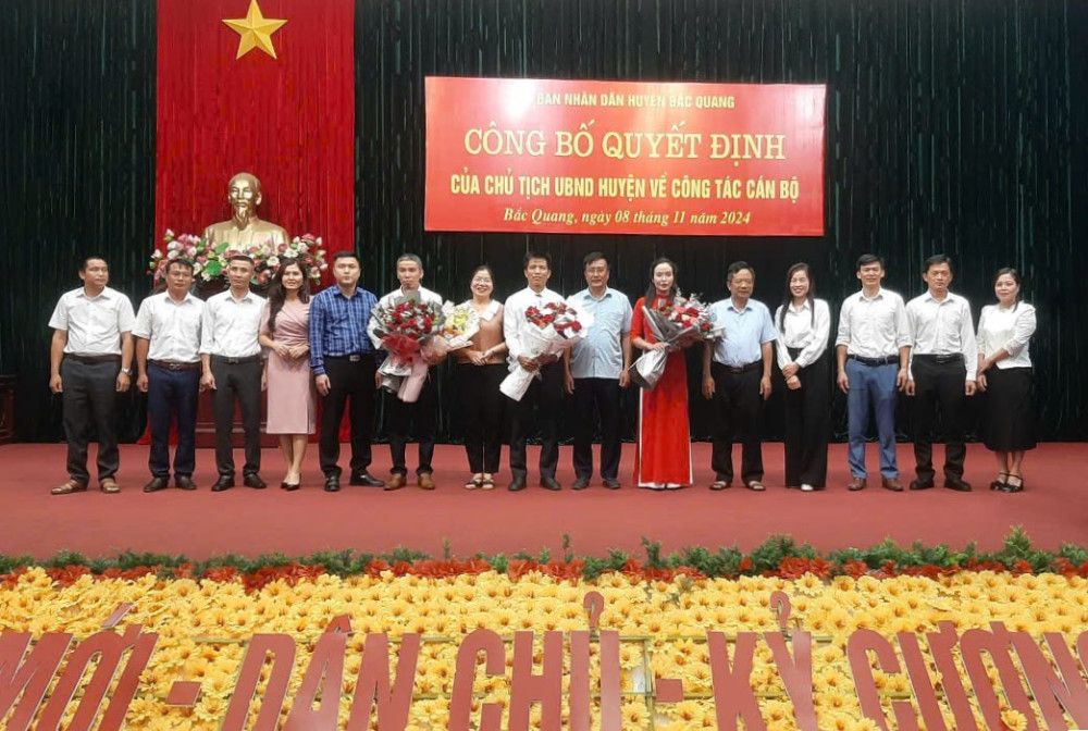 Tại buổi lễ, lãnh đạo Phòng Nội vụ huyện Bắc Quang đã công bố các quyết định điều động, bổ nhiệm, bổ nhiệm lại lãnh đạo quản lý các trường: Mầm non Hữu Sản; Tiểu học Vĩnh Tuy; THCS Nguyễn Huệ; THCS Đồng Yên; THCS Vĩnh Phúc; PTDTBT Tiểu học và THCS Đức Xuân; Mầm non Sơn Ca; Tiểu học Yên Long; Mầm non Việt Quang I; Tiểu học Tân Quang.