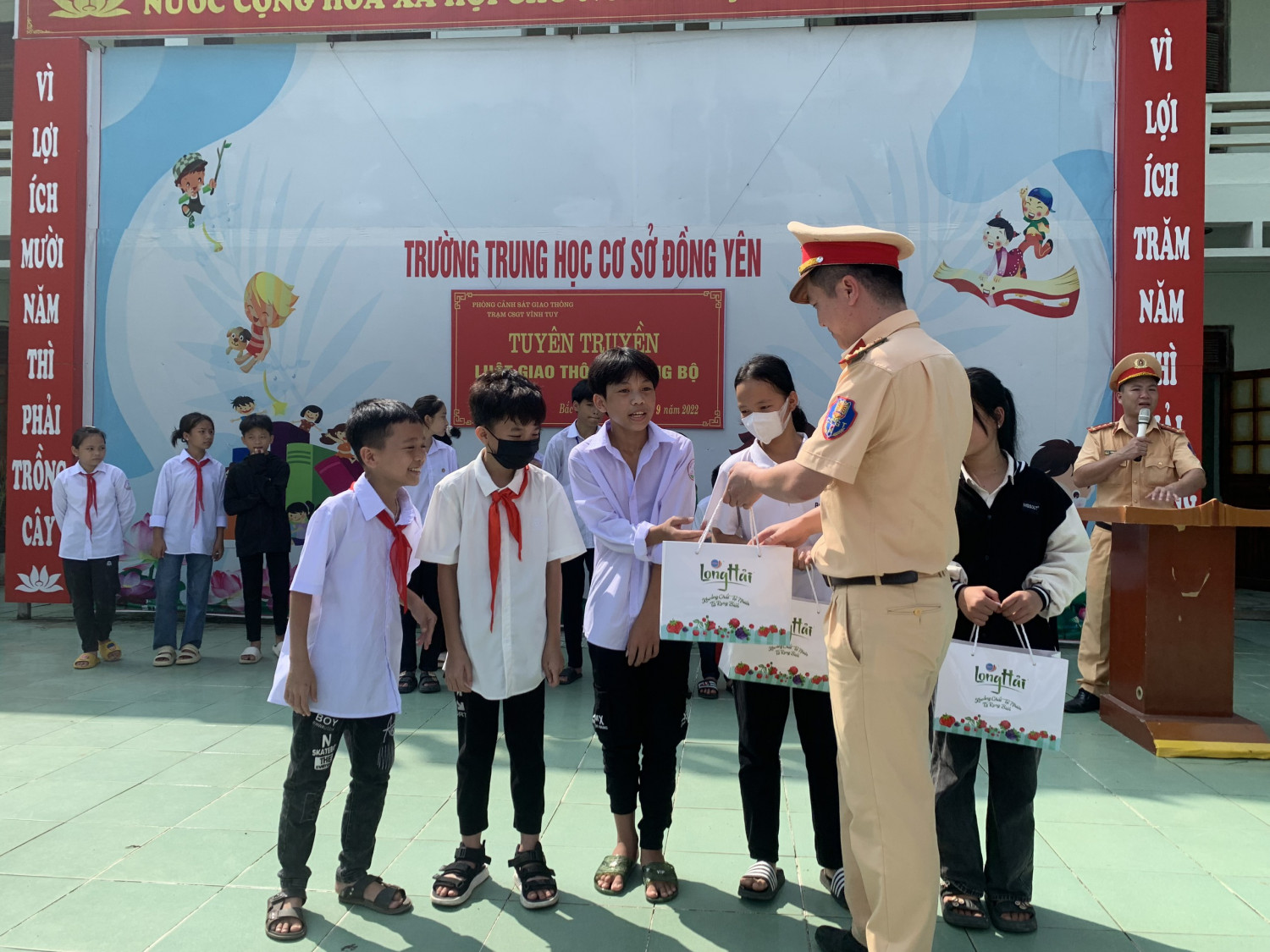 Thực hiện cao điểm đảm bảo trật tự an toàn giao thông (TTATGT), ngày 15/9/2022, Phòng Cảnh sát giao thông công anh tỉnh Hà Giang, trạm cảnh sát giao thông Vĩnh Tuy  phối hợp cùng trường THCS Đồng Yên tổ chức tuyên truyền về an toàn giao thông (ATGT) cho gần 600 cho cán bộ, giáo viên và học sinh Trường Trung học cơ sở Đồng Yên.