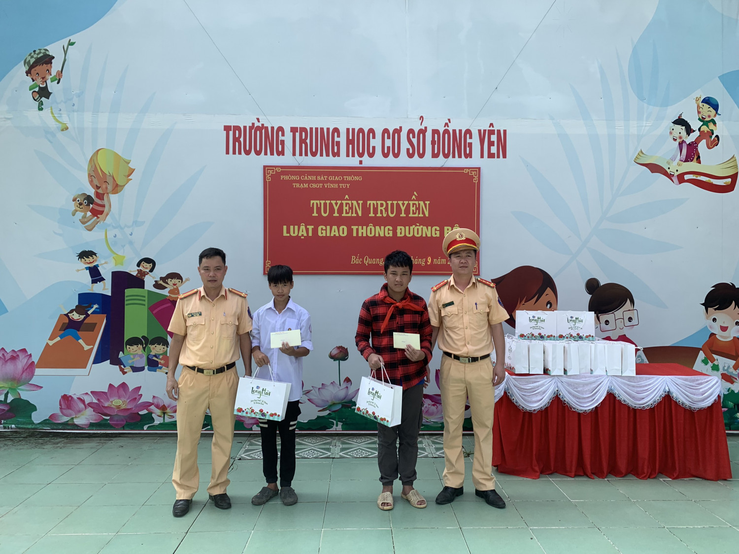 Tại buổi tuyên truyền Phòng Cảnh sát giao thông công anh tỉnh Hà Giang, trạm cảnh sát giao thông Vĩnh Tuy đã tuyên truyền về luật giao thông và nhiều thời gian để động viên thăm hỏi các học sinh có hoàn cảnh khó khăn, đồng thời dành 50 xuất quà tặng học sinh nhà trường cùng với 02 phần quà tặng cho các học sinh có hoàn cảnh đặc biệt khó khăn. Xin được cảm ơn sự quan tâm chia sẻ của các đ/c công an đối với các em học sinh và nhà trường.